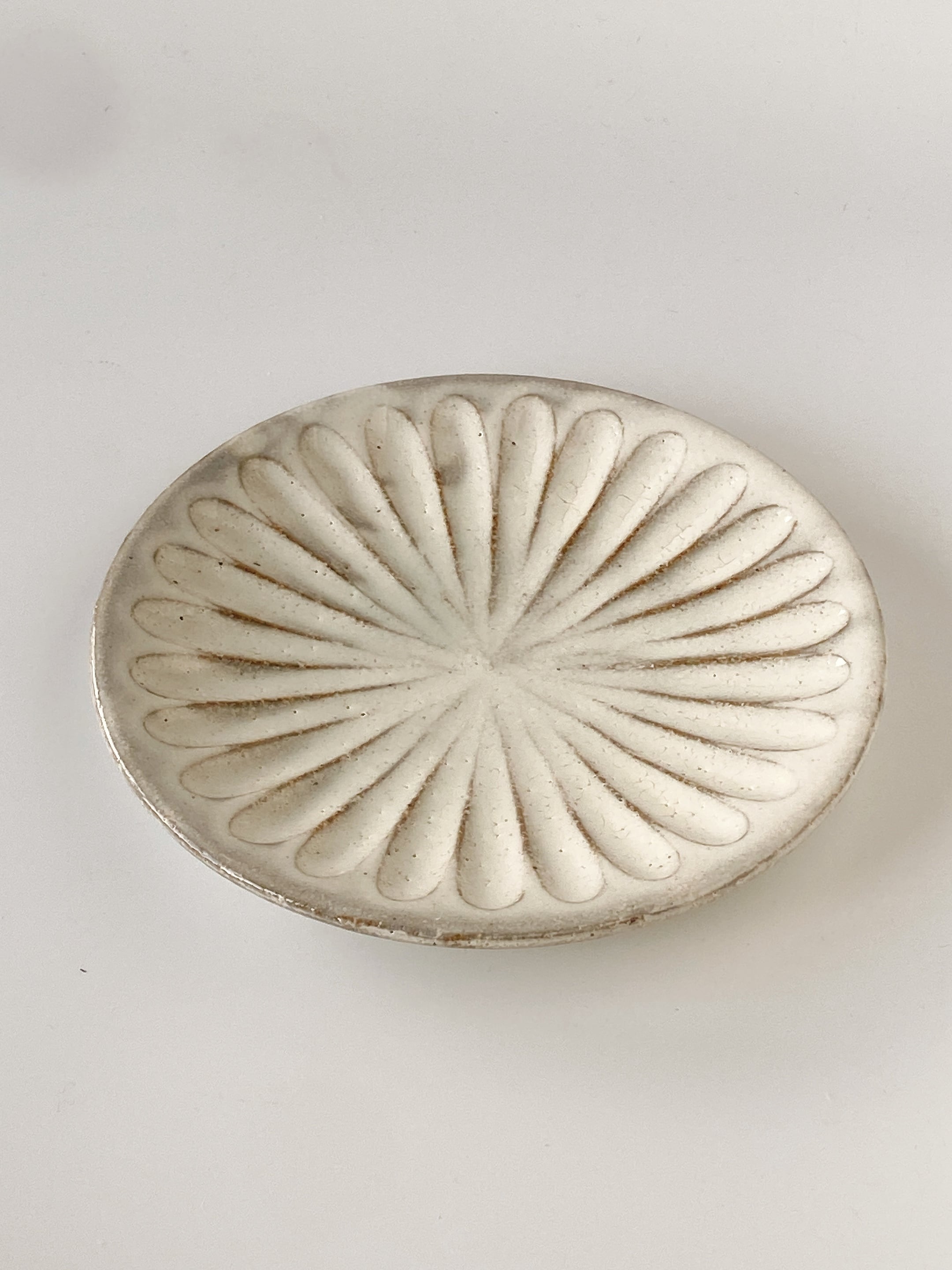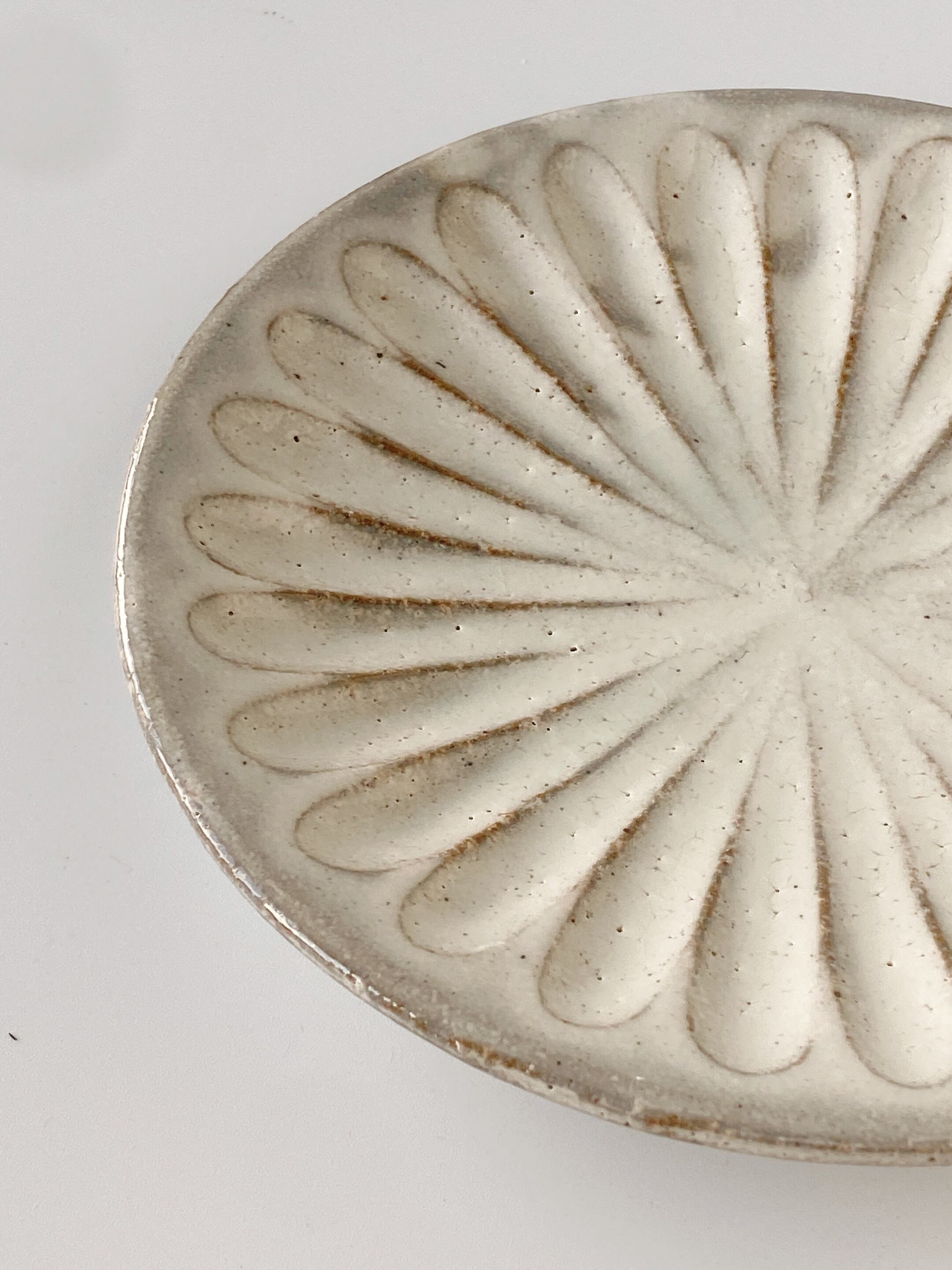 お花がパッと咲いた様に大きく削りを入れた器です。白い釉薬のみを施し、シンプルで土の風合いを生かしています。