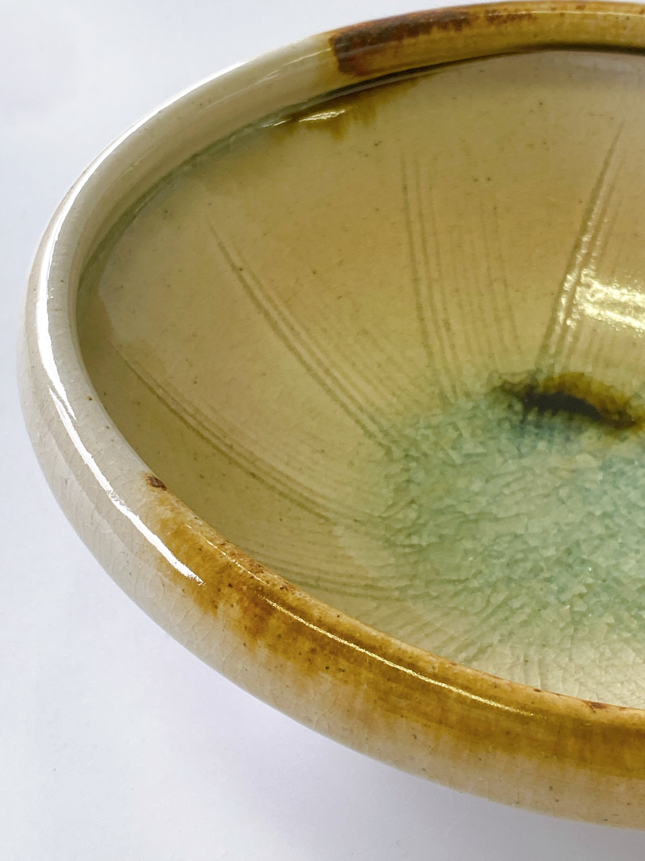 櫛目を付け、ガラス釉が中に集まりキラキラと涼しげです。サラダやスープ、煮込み料理など幅広く
